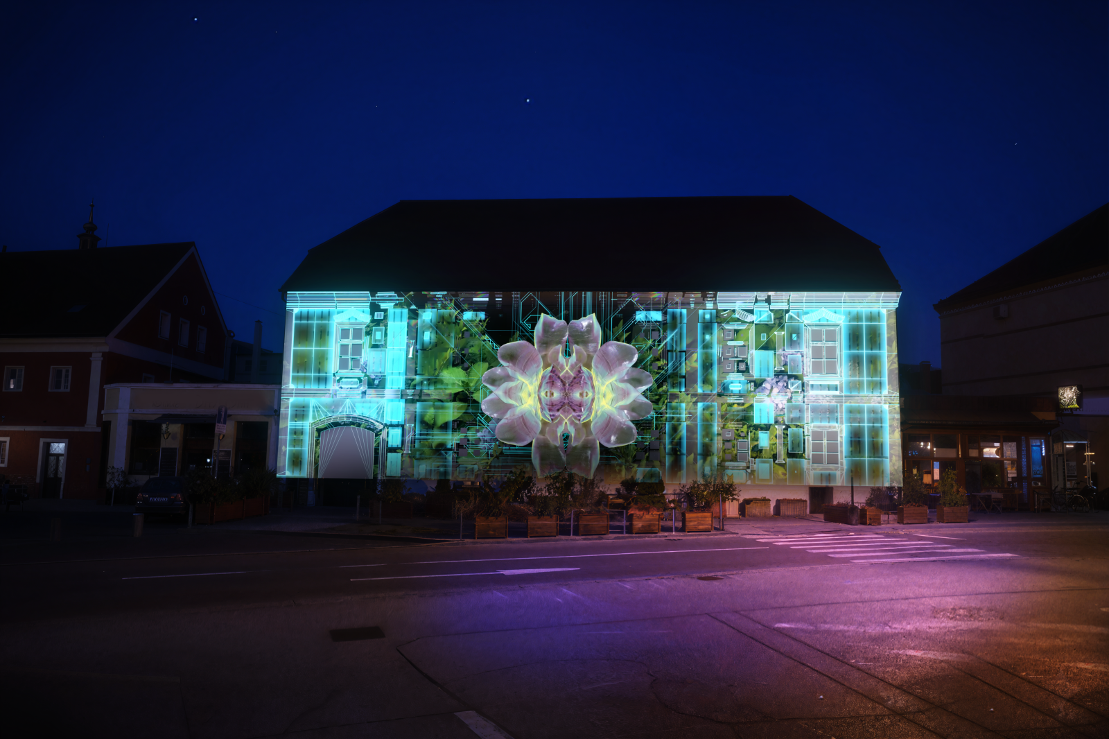 A futuristic ecosystem where bioluminescent, neon life forms flourish. Through projection mapping, organic flower shapes blend with sci-fi aesthetics and iridescent textures. Step into a constructed world where nature and digital technology intertwine, revealing a vision of growth in a synthetic dimension.